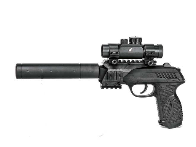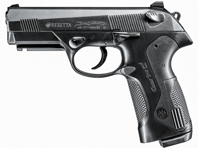 Similar to the Umarex Px4 Storm, the Gamo PT-85 Blowback also uses a reversible 8×2 double magazine to carry up to 16 rounds of .177 target-grade pellets. The SA/DA pistol features a rifled steel barrel, a working manual safety mechanism, a blowback-action slide, fixed white-dot sights and a velocity of up to 450 fps. Overall length is 7.8 inches, and its weight is 24 ounces. (gamousa.com; 954-581-5822)