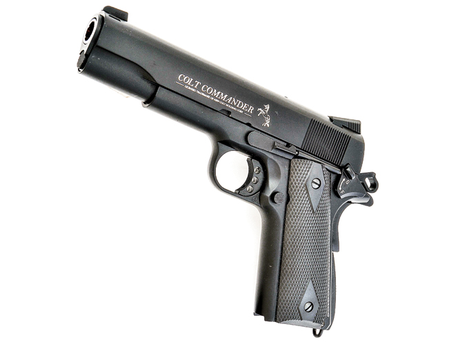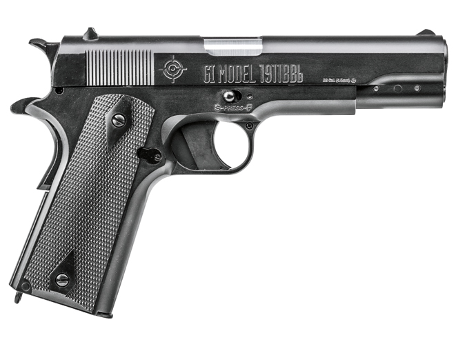 One of the oldest names in air pistols, Crosman also has a 1911 model called the GI 1911BBb with a working blowback action. The pistol’s BB reservoir holds twenty .177-caliber BBs and delivers them downrange at an average velocity of 450 fps. Based on the early 1911 GI issue models, the 1911BBb has a fixed rear sight and a small fixed blade front sight. Not quite as accurate in overall details, but Crosman’s 20-rounder, 1911BBb is a giant leap forward from the single-shot, pneumatic 1911-style air pistols I remember as a kid. (crosman.com; 800-724-7486)