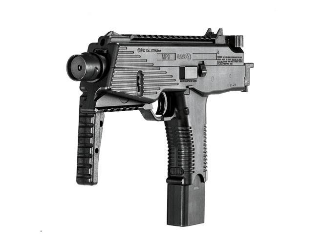 The Gamo MP-9 is an authentic replica of the B&T MP-9 9mm submachine gun. The MP-9 is a lightweight, small airgun with realistic tactical features, including a folding, self-locking stock and adjustable rear sight. The MP-9 is powered by one 12-gram CO2 capsule and can fire 16 shots (either .177 target-grade pellets or precision steel BBs in an 8×2 double mag) in only 2.4 seconds at an average velocity of 450 fps! The MP-9’s semi-auto blowback action and DA trigger make this airgun an excellent choice for tactical practice and plinking. Weighing a solid 3 pounds, the Gamo MP-9 measures 21 inches with the stock extended and 12 inches with it folded. (gamousa.com; 954-581-5822)