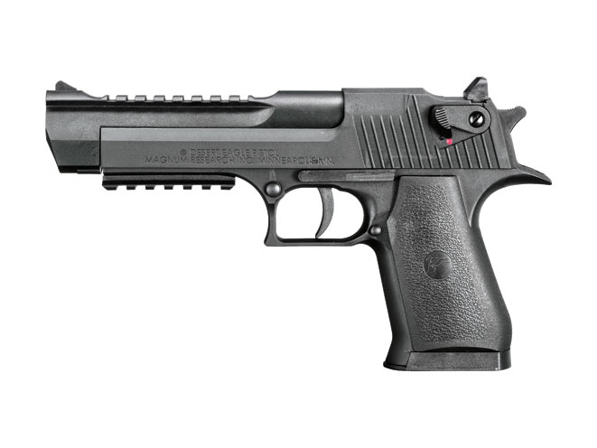 While not a fully functional copy of the legendary IWI Desert Eagle, the air pistol version is a big, weighty, .177-caliber pellet gun designed in the likeness of the real Desert Eagle by Magnum Research, Inc. Usable by both left- and right-handers, this air gun has built-in Picatinny rails for mounting various accessories such as tactical lights and electronic sights. The Desert Eagle air pistol is powered by one 12-gram CO2 cylinder that inserts in the bottom of the grip. The slide opens at the push of a lever to reveal an eight-shot rotary magazine, thus the internal operation is like a revolver. However, unlike most models with rotary magazines, the action on the Desert Eagle functions to provide a realistic effect when shooting. (umarexusa.com; 479-646-4210)