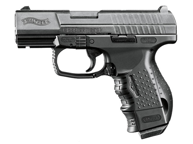 The original Walther CP99 was one of the first truly modern air pistols from Umarex, and it was actually used for training purposes by German police carrying the 9mm P99. The Compact is the second generation of Umarex’s Walther CP99 air pistols. It not only duplicates the feel and handling, but also the functions of the real 9mm and .40 S&W models. Earlier styles used an eight-round rotary magazine loaded into the opened slide, which was then locked closed. The new models load 18 BBs into a trim magazine that inserts into the grip, and the blowback action cycles the slide and chambers the next BB like a true semi-auto pistol. (umarexusa.com; 479-646-4210)