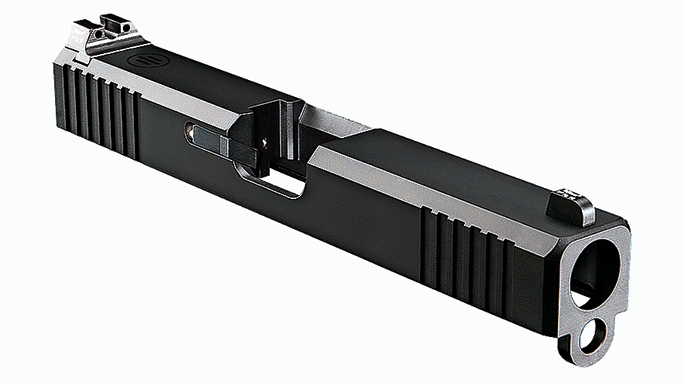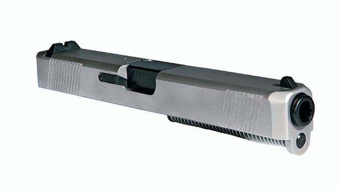 Some shooters want forward slide serrations as well as night sights on their Glock pistols. The Primary Weapons Systems (PWS) Enhanced Duty Slide offers those advantages and more. The slide is machined from a billet of 17-4 stainless steel before being given an Isonite QPQ finish that is super hard and corrosion resistant. Both the front and rear serrations are coarse, providing excellent traction. PWS also outfits the slide with Trijicon HD night sights. The rear sight has a deep U-shaped notch with tiny green dots on either side, and the front sight has a large, yellow dot. The Enhanced Duty Slide also offers a crisp 4-pound trigger break. This is a drop-in replacement. Field-strip your Glock, add the barrel and recoil spring assembly to the Enhanced Duty Slide, reassemble the pistol and you are good to go. The PWS slide is available for Gen1 through Gen3 G17s and G19s.