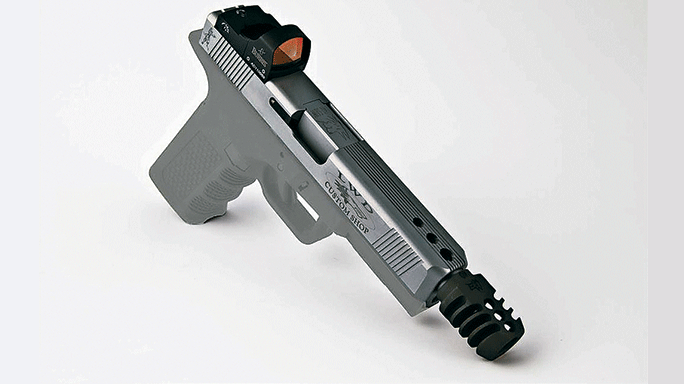 The Werewolf slide assembly from Lone Wolf Distributors is specifically designed for full-sized Glock 22 pistols and comes with hybrid porting; a threaded, stainless steel barrel with a compensator; a Lone Wolf stainless steel guide rod; a 15-pound recoil spring; a 4-pound striker; and more. Lone Wolf also adds its firing pin, gives the entire assembly custom engraving and machines in a reflex sight mount. Finally, the Werewolf upper assembly comes with a Burris FastFire 3 reflex sight for quick targeting. Just attach the Werewolf to your G22 frame.