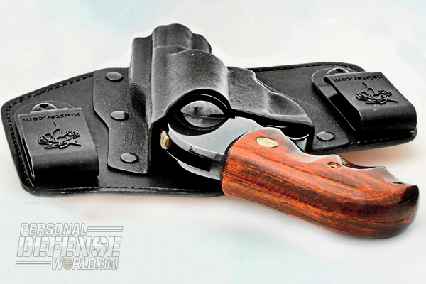 The DeSantis Intruder line of IWB rigs uses a combination of a form-fit Kydex pouch riveted to a leather skirt, again separating the pouch and firearm from being in contact with your body. The Intruder firmly engages the triggerguard, and the DeSantis line is available to fit a host of revolvers and semi-autos, providing maximum concealment with the security of full firearm retention.