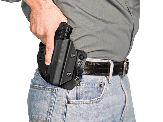 OWBs are probably the most popular style of holster. These are typically worn from the 3 o’clock back to the 6 o’ clock, but also can be worn from the 9 to 11 o’clock as a crossdraw. Crossdraw holsters are excellent for someone who spends most of their time seated and may have to draw from that position. However, they present the gun, butt first, toward an adversary. They are also typically slower to get on target than a pistol carried on the strong side. Most OWB holsters worn on the strong side will come with the “FBI cant,” meaning that the gun is tilted slightly forward. This is to aid in concealment. The grip remains the toughest part of the pistol to conceal. Canting the holster forward slightly makes the telltale bulge under a shirt or jacket much less obvious. This cant also makes it easier to draw when the gun is positioned further back on your body, typically in the 4 o’clock position, right behind your “love handle.” (Pictured: Alien Gear Cloak Slide OWB)