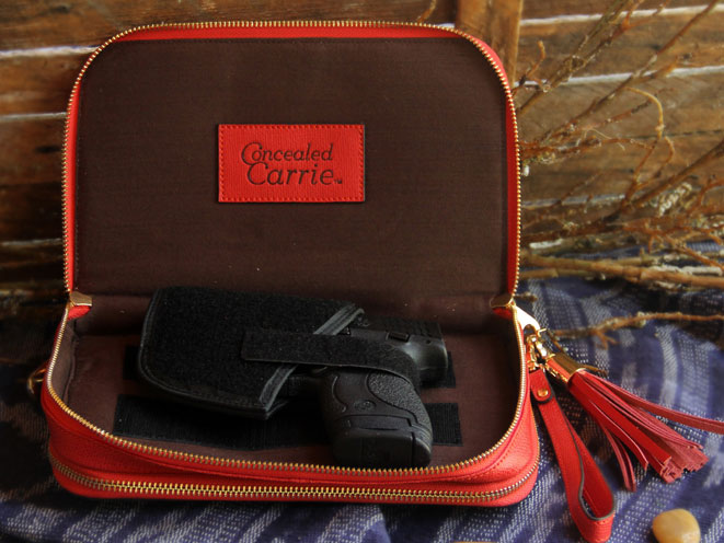 Women carry purses and men can usually get away with carrying a backpack, messenger bag or attaché. All of these can be purchased with hidden holsters built in. While they are excellent at concealment, they are also easily snatched away by a thief, can easily be left unattended in a shopping cart or restaurant table, and are vulnerable to the exploring hands of curious children. While these holsters certainly have their place, a lot of extra precautions and care should be taken when using them. (Pictured: Concealed Carrie Bright Red Leather Compact)