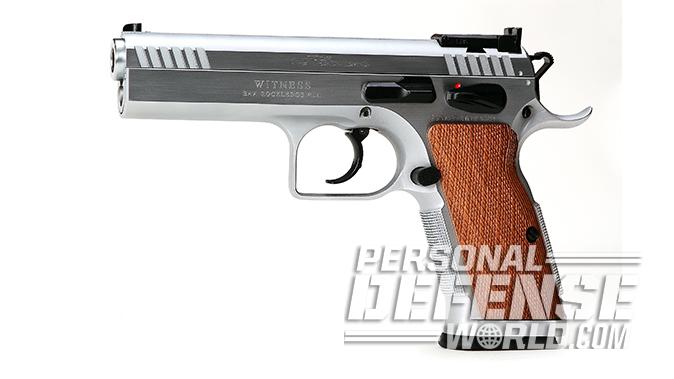 Made in Italy by Tanfoglio, the EAA Witness Elite Stock II is an all-stainless-steel pistol with a double- action/single-action (DA/SA) trigger system and an ambidextrous safety on the frame. The full-length slide rails are on the inside of the frame, which lets the slide sit deeper, lowering the bore axis to reduce felt recoil and muzzle flip. It also has a fully adjustable rear sight, and the magazine holds 14 rounds of ammo.