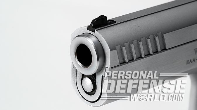 The Ruger’s short SA trigger was the unanimous choice among the four guns. Two shooters found the EAA and Sig’s curved triggers pinched their trigger fingers unless they placed them high on the trigger. Of our two DA/SA pistols, the EAA had the lightest, smoothest DA stroke, but one shooter felt it required excessive travel to reset. The Glock’s Safe Action trigger was like every other Glock trigger we’ve ever fired with a short stroke. It was easy to use but quite gritty.