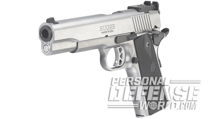 Ruger’s 10mm SR1911 Target is an all-stainless-steel 1911 and is notable as the first SR1911 to use a fully supported, ramped, bushing-less, match-grade bull barrel for enhanced accuracy and additional recoil-dampening weight. It has a single-action trigger, a single-stack magazine and an adjustable rear sight.