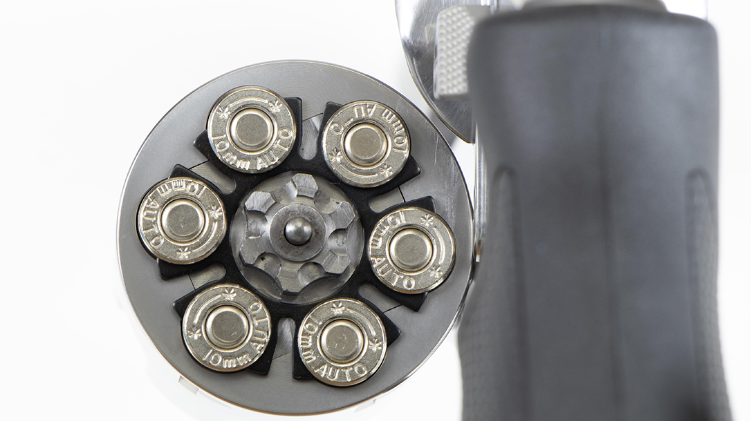 Revolvers frequently offer flexibility that bottom feeders cannot provide. In the case of the 610, you can shoot both 10mm and .40 S&W cartridges without a single modification to the gun. Most shooters know you can fire .38 Specials in a .357 Magnum wheelgun, and the 610 works the same way with 10mm and .40 rounds.