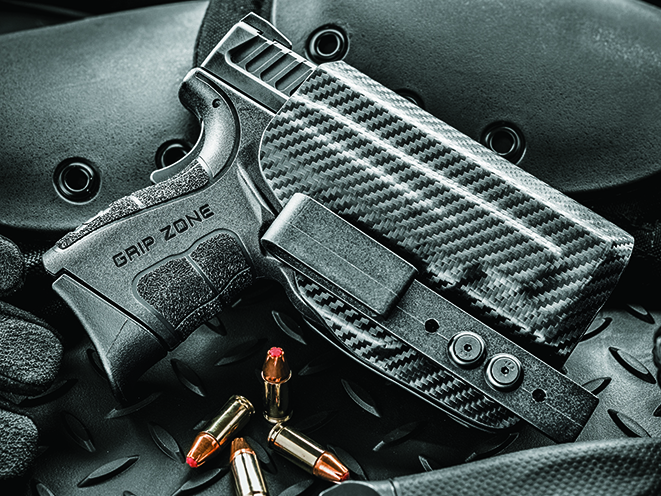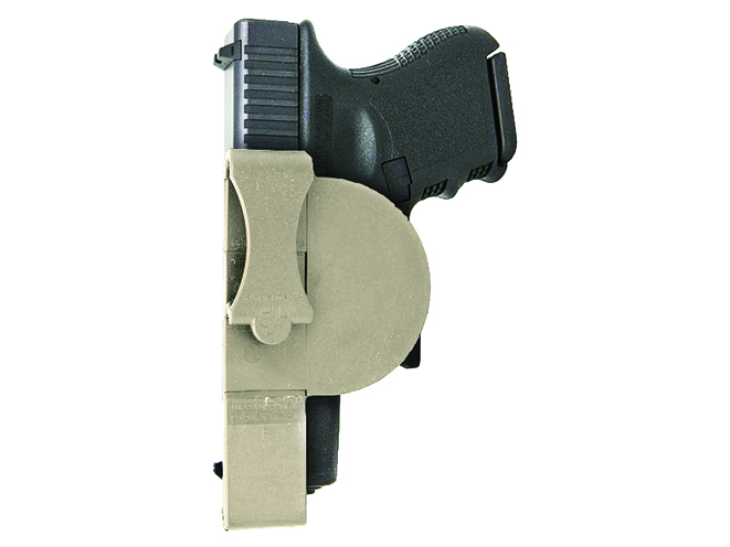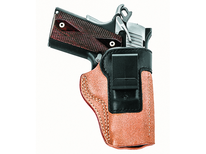 The Compact Discreet Carry (CDC) holster from DSG Arms is constructed of smooth Kydex for more comfortable all-day carry and a fast, smooth draw. It has an adjustable retention device and is designed with a sight channel that is compatible with night sights. The CDC is easy to put on or take off with a rubber-mounted belt clip for belts 1.5 inches wide, and it’s adjustable for a vertical or forward cant.
