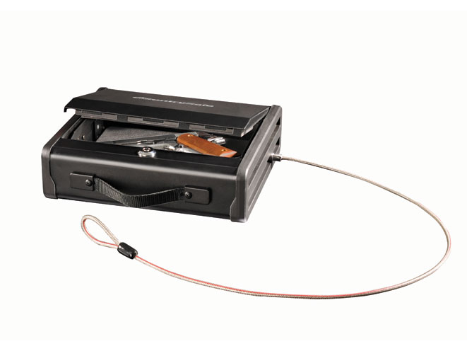 The Hornady RAPiD safe uses a radio-frequency identification (RFID) system. The RFID tag is embedded in a wearable bracelet, a convenient key fob or inside a plastic card you can store in your wallet. Just wave the RFID in front of the reader and the safe opens. The front of the safe also has a simple, four-button, programmable code that can be entered to access the safe as a backup. The safe also allows for key-operated opening. The safe itself is made from 16-gauge steel and is very solidly built, weighing over 15 pounds. For additional safety, a 1,500-pound-rated steel cable is included, which allows the user to secure the entire safe and its contents to a solid object so that it cannot be removed by an unauthorized person. The exterior dimensions, while not diminutive at 15 inches long, 9 inches wide and 3 inches tall, will still fit inside most dresser drawers.