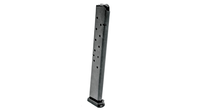 With ProMag Industries’ 15-round COL-A5 magazine, you can more than double the capacity of your full-sized, .45 ACP, 1911-style pistol. The magazine body is made from heat-treated steel and given a blued finish, then ProMag equips the body with a follower, lock plate and baseplate molded from Technapolymer for smooth functioning. The American-made mags come with a lifetime warranty. The MSRP is $30.