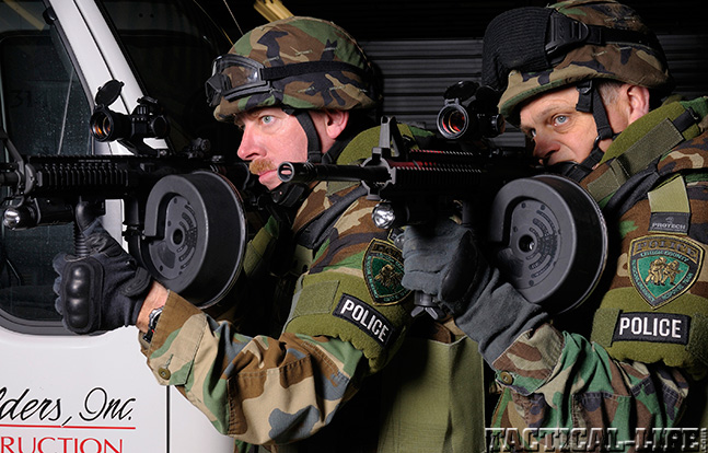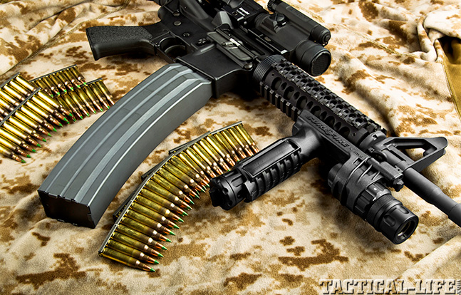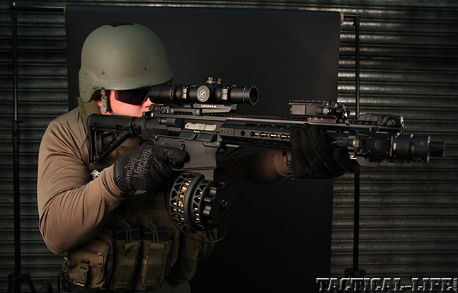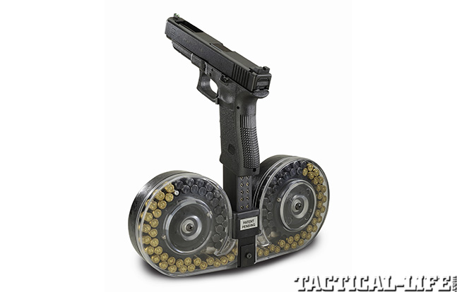 The aptly named 90-Rounder from MWG offers you just that, 90 rounds of hellfire. This high-capacity magazine uses a snail-drum design and high-impact polymers for a lightweight, low-maintenance, reliable feeder for an AR platform. The 90-Rounder’s loaded weight is 3.6 pounds, and it’s length is 7.75 inches—only 0.75 inches longer than a mil-spec 30-round magazine. The back of the magazine is made of clear polymer so an operator can easily and quickly view the remaining rounds. The snail drum tucks to the left side of the weapon. MWG also offers similar magazines with smaller capacities.