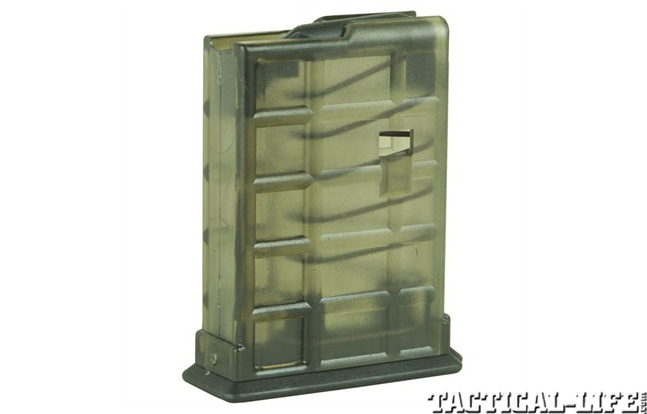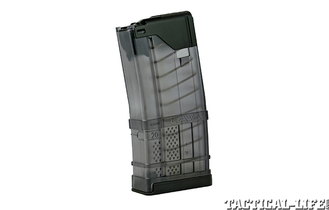 Lancer’s L7 Adanced Warfighter Magazine (L7AWM) is designed for 7.62mm/.308 Winchester ARs and is available in five-, 10- and 20-round capacities. These hybrid magazines combine the reliability of a steel magazine with the weight savings of a polymer magazine. Lancer magazines have a one-piece-wraparound steel feed lip assembly permanently bonded to an impact-resistant polymer magazine body. The body is textured for a sure grip with or without gloved hands. The polymer is translucent so a shooter can easily see the remaining round count. The spring is stainless steel. Lancer’s L5AWM mags are designed for the 5.56mm and come in 10- and 30-round capacities.