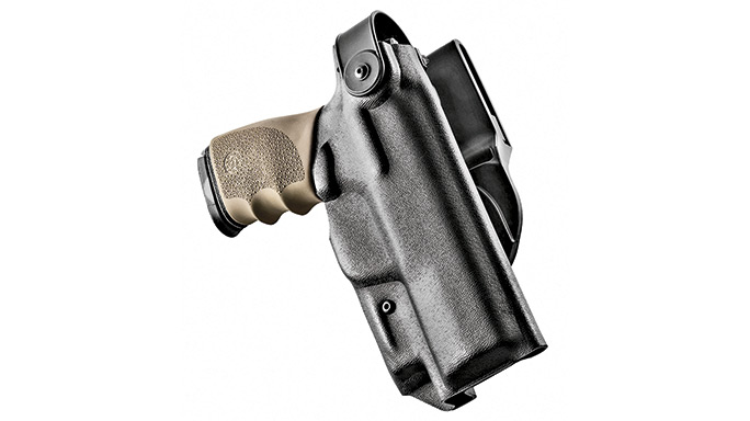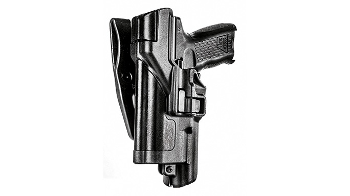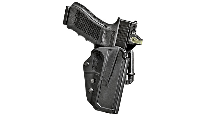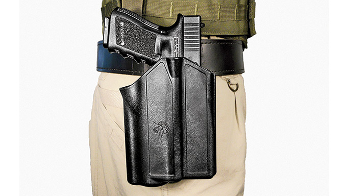 Hogue made its name as one of the preeminent makers of wood and rubber aftermarket grips for duty guns. Hogue still makes aftermarket grips, but it has also branched out into the duty holster field. The ARS Stage 2 features Hogue’s Auto Retention System, which locks the gun into place during reholstering, as well as a rotating hood that clears in one motion as part of the drawstroke. The ARS can also be mounted on an available thigh rig.