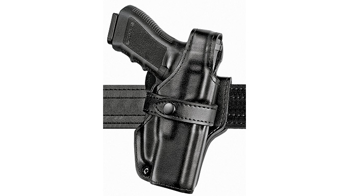A storied holster-maker that now resides in its own line under The Safariland Group, Bianchi is still a player in the duty holster field. Available in synthetic AccuMold with nylon, the Model 7120 Defender utilizes a metal-reinforced thumb break and the Bianchi “Pinch” triggerguard retention device. This is a “mid-ride” holster, which means the wearer’s elbow and forearm will fall naturally across the grip, discouraging gun grab attempts. For a leather appearance, the Model 7920 Defender II is also available.