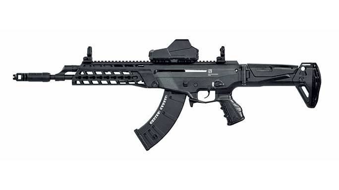 Kalashnikov USA’s Alfa is based on the AK but features an updated exterior with a modular forend, an adjustable buttstock and pistol grip, ambidextrous controls and a reversible charging handle. (kalashnikov-usa.com)