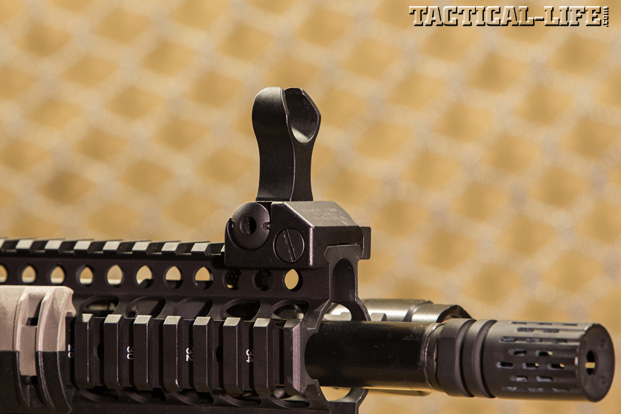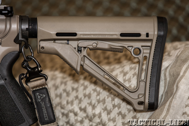 There is very little that’s standard on the Prepper’s AR-15. The flat-top upper and M15SA lower receiver were manufactured by LRB of Long Island to Mil-Spec from aircraft-grade 7075-T6 aluminum forgings—the same alloy found in U.S. military M16 and M4 carbines—and finished with a hard anodized MIL-A-8625 coating. Dan purchased a BattleComp flash suppressor/compensator and a CMMG medium contour 16-inch stainless-steel barrel with a 1:7 twist. Dan then cut the barrel to 11.5 inches and had it re-crowned by Iron Ridge Arms, which also provided the gun its bolt release lever, custom (4.5 pound) foley trigger assembly and dark earth green Cerakote finish. The Prepper’s adjustable CTR Stock, pistol grip, sling attachment, sling, vertical grip, rail covers, oversize trigger guard and magazines are all Magpul made. An Aimpoint T-1 Micro with a Larue quick release sits atop the Larue free-float rail system. The bolt and bolt carrier group are Colt’s; the front-folding BUIS Troy Industries’; and the rear BUIS, adjustable to 600 meters, Matech’s. Completing the setup are a Boonie Packer Redi-Mag and a Surefire tactical light. Dan purchased the remaining parts from online sources.