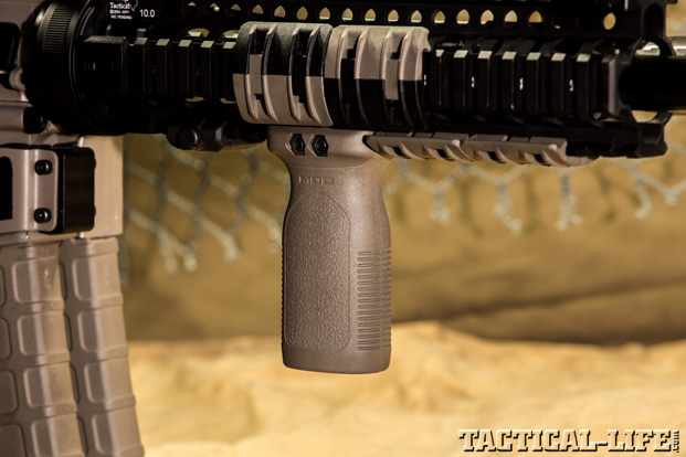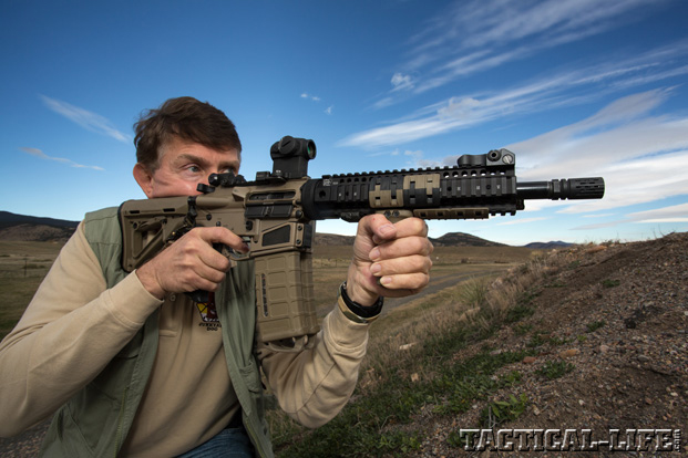 At the range, I shrugged into the Magpul single-point sling, snapped it onto the rifle mount and adjusted the stock. The Redi-Mag is attached to the left side of the magazine well and holds a spare magazine. With some practice, I was able to jettison the empty magazine, extract the spare and reload without too many fumbles. I like the idea of a spare magazine on the gun for those incidents that begin with a bump in the night, when a quick response does not allow for grabbing spare magazines, let alone stuffing them into one’s jammies on the way out the bedroom door. I did end up dropping the empty magazine on the ground as part of the reload, and I know that is a no-no for a lot of people. Clearly, with any custom weapons system, there is a need to go back to basics and analyze and retrain for the most effective use of the equipment. With its spare magazine and other accessories, the Prepper’s rifle is no lightweight, even with a shorter barrel. But it does make for a stable firing platform, and its short overall length puts the center of gravity closer to the shooter than do some other longer AR-15 models. The vertical foregrip and adjustable buttstock make for comfortable shooting, and I found it easy to keep the gun tucked in tight as I practiced pie-ing around corners.