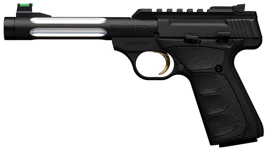 This new rimfire pistol from Browning is a great option for small-game hunting with a suppressor, as the 6-inch bull barrel comes with 1/2×28-tpi threading, as well as a thread protector. This blowback-operated pistol also has a Picatinny top rail, a TruGlo/Marble Arms fiber-optic front sight and a white-outlined Pro-Target adjustable rear sight. The Ultragrip FX ambidextrous grip frame and gold single-action trigger really add to the shooting experience.