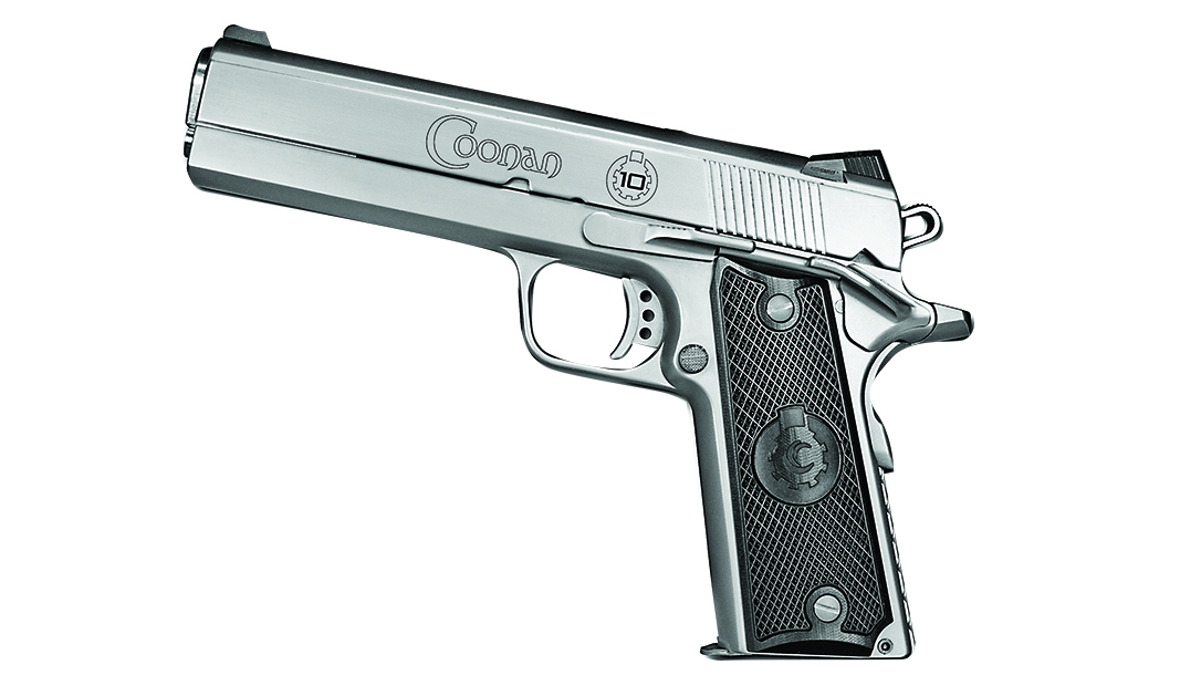 Renowned for its .357 Magnum 1911s, Coonan Arms has adapted its design to create a stainless-steel pistol to take the popular 10mm Auto cartridge. It comes with a 5-inch barrel, a unique full-length dust cover, black walnut grips, Novak sights, a skeletonized Commander-style hammer, an extended thumb safety and slide stop, and an 8+1 capacity. The MOT 10 is 8.6 inches long and weighs 39.2 ounces unloaded.