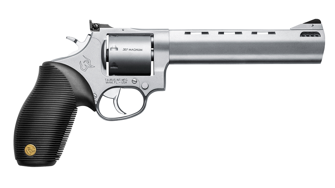 An exciting addition for 2018, this is a seven-shot, medium-frame .357 Magnum revolver in stainless or matte black that, with a simple cylinder change, can be converted to fire 9mm rounds using Taurus’ Stellar clips. It’s a traditional DA/SA design with a fixed ramp front sight, an adjustable rear sight and a black “Ribber” grip. Taurus offers the revolver with either a 3- or 6.5-inch barrel.