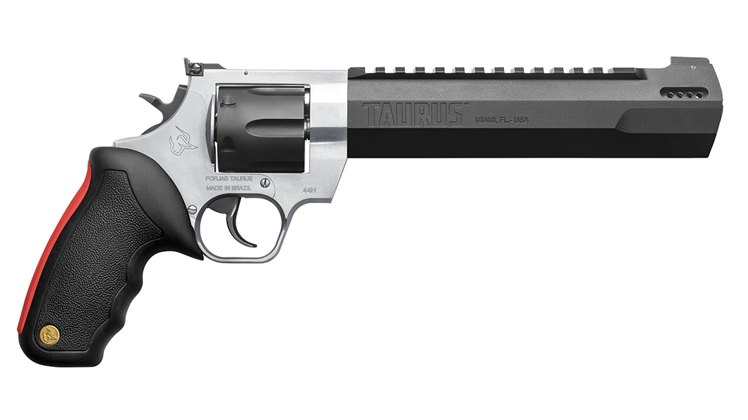 The new Raging Hunter from Taurus is a six-shot .44 Magnum revolver with a striking stainless and blued two-tone finish. It also features an optics-ready Picatinny rail and an angular barrel shroud for more modern touches that help it stand apart from the pack. The unique barrel system incorporates a steel sleeve inserted in an aluminum housing to cut down on the overall weight, making this a well-balanced sidearm for hunting. To help with recoil, the gun has a cushioned rubber grip as well as factory-tuned porting and a gas expansion chamber. These also help reduce muzzle rise for faster follow-up shots. An all-blued model is also available.