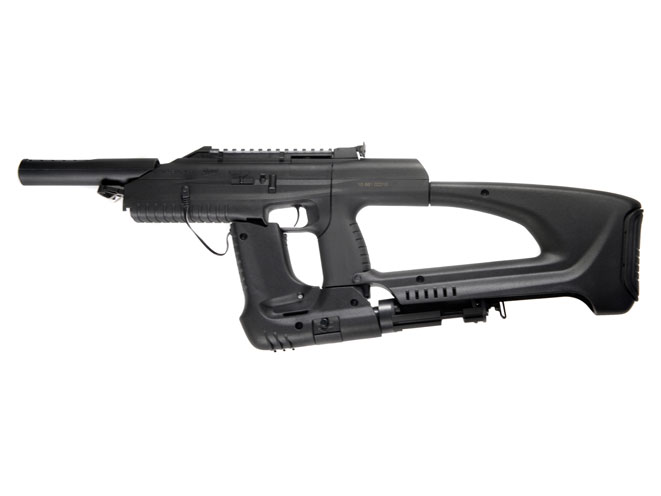 Part air rifle, part air pistol, the MP661k-09 DROZD has a select-fire system—one-, three- and six-round burst—with a 600-rpm rate of fire. Equipped with a 400-round, hopper-fed magazine, the DROZD is fueled by 12- or 88-gram CO2 cartridges and has a velocity of 541 fps through the rifled barrel. A weaver rail allows a user to mount a red-dot sight. The stock is detachable.