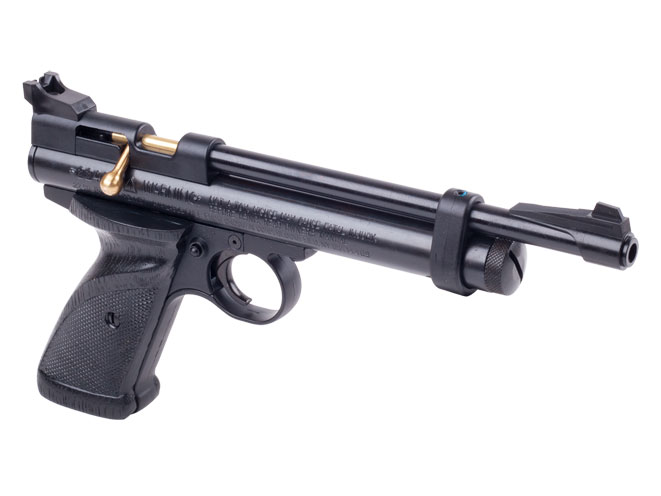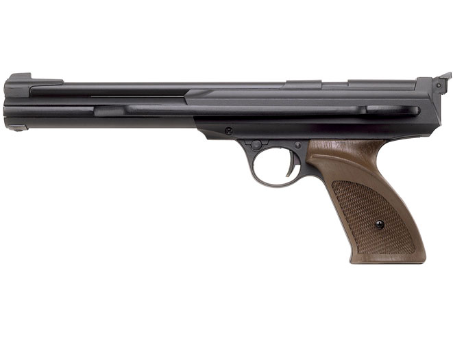This .177 bolt-action pistol is powered by CO2 cartridges and features a rifled steel barrel to aid accuracy. This pistol has a cult-like following with users who customize the 2240 to their personal preferences. The grip angle is ergonomic and ambidextrous. Similar to a bolt-action rifle, the 2240’s small bolt is racked to singularly load a pellet. Available in .22 (Model 1322). For more information, visit http://www.crosman.com or call 800-724-7486.