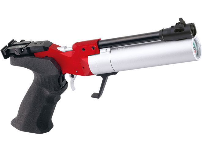 The P11 Piccolo offers Olympic-style accuracy in a PCP (pre-charged pneumatic) pistol. A PCP pistol is charged with air from a large tank like a scuba tank. The P11 is virtually recoil-free, accurate and consistent. Virtually every thing on the P11 is adjustable, from the front and rear sights to the five-way adjustable trigger and grip. This is a high-end, 10-meter competitor.