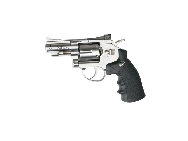 This snub-nose revolver from ActionSportGames (ASG) shoots realistically and comes with a slick silver finish. This full-metal replica of a Dan Wesson revolver is a double-action/single-action (DA/SA). One BB is loaded into each realistic-looking cartridge, then each cartridge is loaded into the cylinder’s chambers. The cylinder rotates as each pellet is fired. A speedloader comes with the revolver. The CO2 cartridge is stored under the grip.