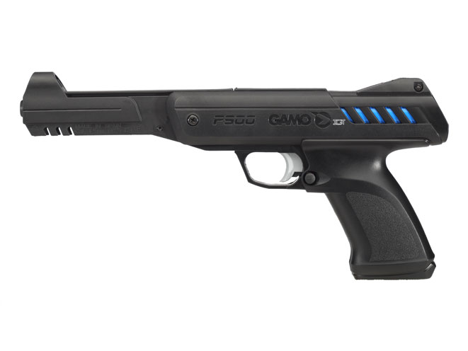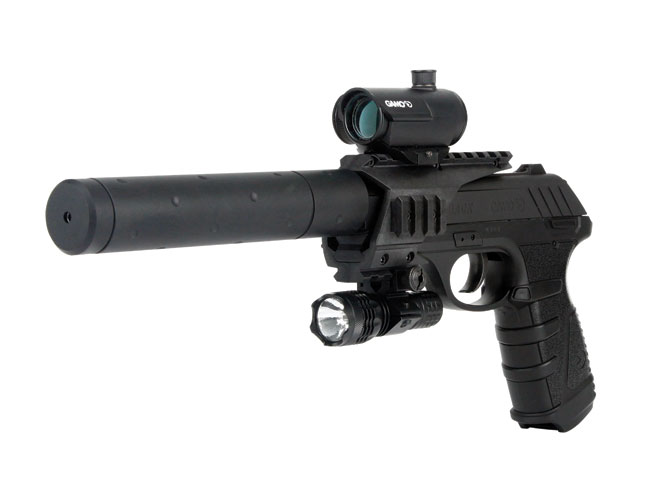 The P-25 Blowback is powered by a CO2 cartridge that uses some of the gas to move the slide rearward after a pellet is fired in single- or double-action mode. The 16-pellet magazine is loaded into the pistol similarly as a firearm. The steel rifled barrel ensures good accuracy. The P-25 Blowback Tactical is a tricked-out version with an extended barrel and a faux suppressor, a red/green/blue-dot sight and an 80-lumen tactical light. For more information, visit gamousa.com or call 954-581-5822.
