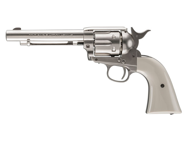 Get your cowboy on with the Colt Peacemaker and practice your fast-draw more safely. This all-metal replica of a Single Action Army has a realistic revolver-style action: If you cock the hammer, the cylinder rotates. The Peacemaker uses CO2 cartridges hidden in the ersatz ivory grip. Blue and nickel finishes are available. For more information, visit http://www.umarexusa.com or call 479-646-4210.
