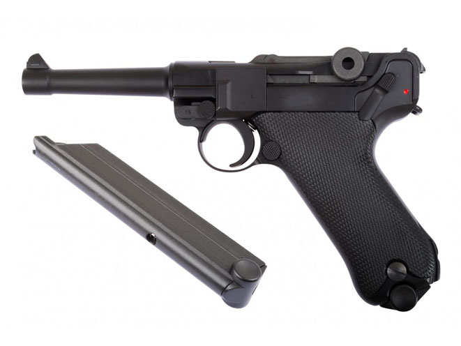 The WE-Tech P08 is a full-metal replica of the legendary German Luger from WWI and WWII. Using green gas, the P08 fires a soft 6mm BB with realistic blowback action—the toggle actually cycles. This P08 also breaks down similar to a Luger firearm. For looks and realism, this is as close to real Luger as you can get. Finished in flat black or chrome, other models are available with different barrel lengths. To power it up, hold a green gas canister upside down and insert the nozzle into the P08’s magazine.