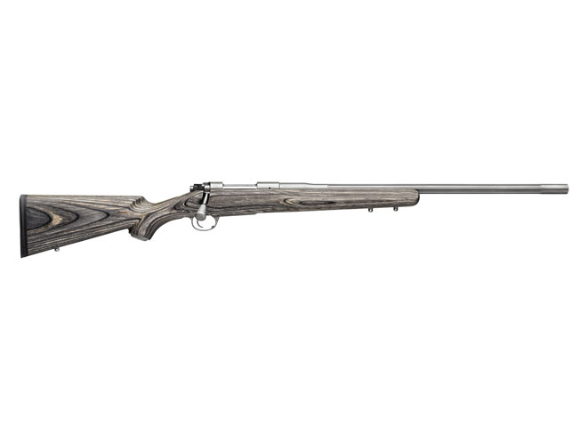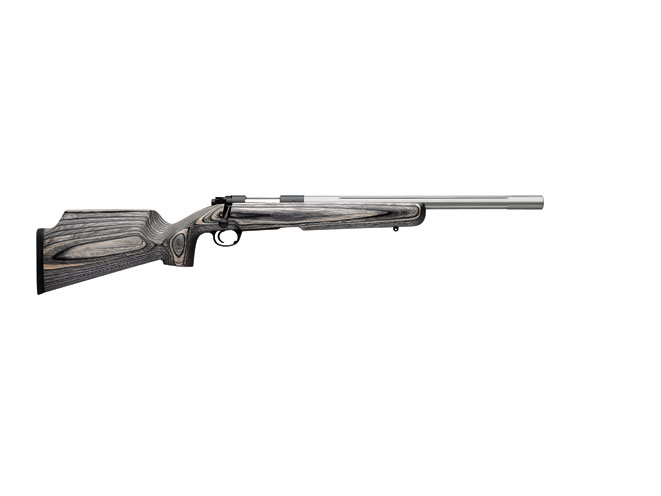 With sub-MOA accuracy, the LongMaster VT is ideal for taking prairie dogs and other varmints at long distances. The 26-inch, stainless steel barrel is fluted to improve cooling and reduce weight for a long day of shooting. Both the chamber and barrel are match-grade, and the rifle is available in .22-250 Rem. The gray laminated stock has a front swivel stud for a bipod and a 0.5-inch-thick recoil pad.