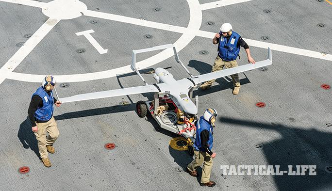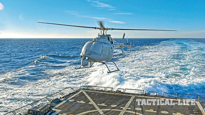 MQ-8 Fire Scout: The Fire Scout is a four-bladed rotorcraft providing the Navy with recon, fire support and aerial targeting capabilities. Developed by Northrop Grumman, the C-model is derived from a Bell 407 and the B-model from a Schweizer light helicopter. In addition to turret-mounted sensors, it has the ability to carry laser-guided 70mm rockets. It can detect submerged mines in littoral areas. The MQ-8 has operated in the Middle East and Afghanistan and conducted anti-piracy missions off East Africa. The C-model’s mission endurance is about 12 hours fully loaded, and its cruise speed is about 155 mph, while the B-model has an endurance of five hours at 198 mph. For more information, visit northropgrumman.com or call 703-280-2900.