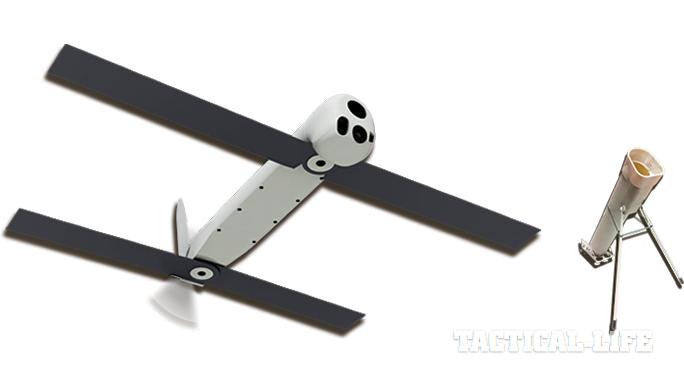 Switchblade: Developed by AeroVironment for the U.S. Army and Marine Corps, the Switchblade is an expendable, loitering munition for beyond-line-of-sight targets, not a UAS. The system, a mortar-like launching tube and its payload, weighs only 5.5 pounds. The munition vehicle itself can be guided into a target with the same control console used for the RQ-11 Raven and RQ-20 Puma, using its onboard camera. The warhead is equivalent to a 40mm grenade. Its electric engine is quiet and efficient, enabling it to fly into a target without detection. It can also be flown back for reuse if no target is available. For more information, visit avinc.com or call 626-637-9983.