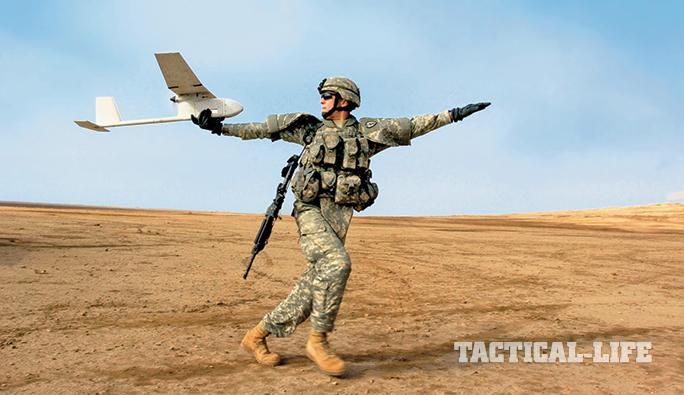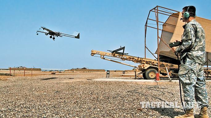 RQ-11 Raven: AeroVironment, a leading micro-UAV developer, has produced the Raven for the U.S. and allied forces since 2006. It is a tiny tactical recon platform weighing just over 4 pounds with a 4.5-foot wingspan, and it can fly for about 90 minutes with a 6-mile operational radius at typical altitudes of 500 feet and 25-mph cruise speeds. It carries a CCD (charged-couple device) video camera and an infrared camera for night flights. In the air, the Raven can be remotely controlled or operate autonomously with GPS waypoints. One control panel keystroke aborts a mission and returns the RQ-11 to its takeoff point. For more information, visit avinc.com or call 626-637-9983.