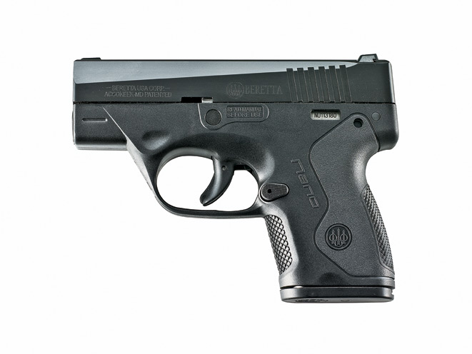 When it designed the Nano, Beretta reimagined the concealed-carry pistol. These striker-fired guns have been contoured to prevent snagging on clothing during the draw, and have a width of only 0.9 inches. Chambered in 9mm, the Nano comes with six- and eight-round magazines. Additionally, the frames can be quickly swapped out for the shooter’s preferences. MSRP: $445. (http://www.berettausa.com; 800-929-2901)