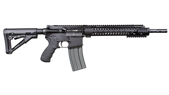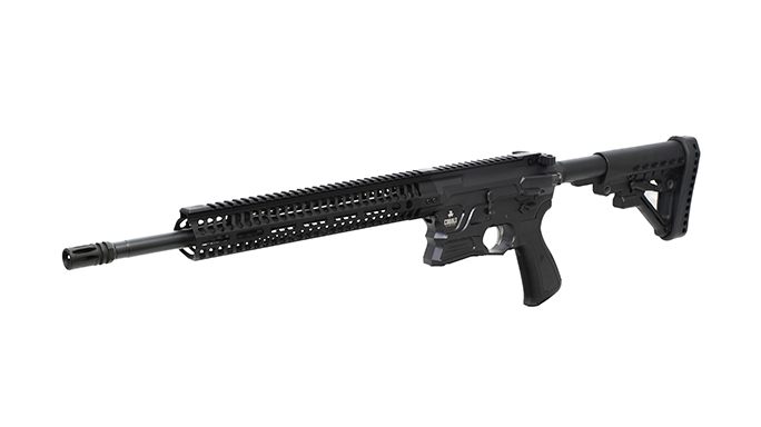Cobalt Kinetics Black Tactical: Built with a .223 Wylde chamber to allow the use of either .223 Remington or 5.56mm ammo, this optimized rifle sports a dual-drop bolt release, a 45-degree safety selector and an extended mag catch. The mag well is beveled for fast magazine changes, and the fire control pins are threaded. The 16-inch, standard-profile, Melonite-coated barrel makes for a handy, lightweight package. For furniture, the rifle has an Archangel buttstock, a Hogue pistol grip and a 12.5-inch, free-floating Odin Works M-LOK handguard for mounting accessories like lights and lasers for quick targeting. The mid-length gas system balances maneuverability and reliability.
