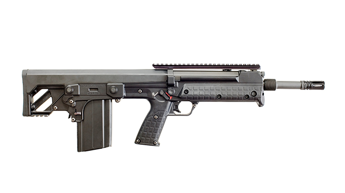 Kel-Tec RFB: RFB stands for “Rifle, Forward-ejecting Bullpup,” and it is the absolute smallest platform available for launching full-sized .308 rounds. Brilliantly conceived and professionally executed, the RFB feeds from standard 20-round FN FAL magazines and ejects through a tube out in front of the weapon. The RFB weighs just over 8 pounds unloaded and has an overall length of only 26 inches. Because of its forward-ejecting design, the gun is fully ambidextrous and comparably amenable to either shoulder. For full-powered .30-caliber thump in the tiniest possible package, nobody else even comes close to the Kel-Tec RFB.