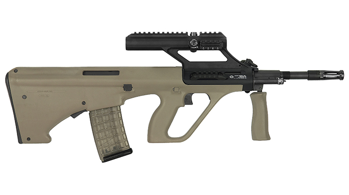 Steyr AUG A3 M1: When it was introduced in 1977, the Steyr AUG was the most advanced infantry rifle ever devised. Making use of a revolutionary bullpup design (the action of the gun resides behind the pistol grip) and incorporating advanced polymers in the stock, the AUG turned the gun world on its ear. Now, nearly 40 years later, the AUG is still at the vanguard of tactical rifle design. The AUG A3 M1 balances wonderfully and its simple controls are easy to manage under stress. Magazine changes are fast and intuitive on the new models thanks to an automatic bolt-hold-open, and the reliability of the AUG’s adjustable piston system is well established.