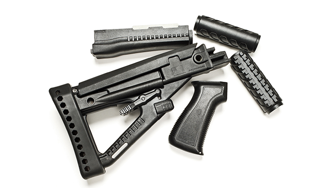 Archangel AA47 OPFOR Series: Archangel Manufacturing’s polymer AA47 OPFOR Series kit will fit on most AK variants. This upgrade kit includes an ergonomic handguard with an internal heat shield and optional Picatinny rails, a redesigned pistol grip with an internal storage compartment and aggressive texturing for a better hold, and an AR-style collapsible buttstock with ambidextrous QD sling attachment points. These stock sets area available in black, desert tan and OD green.