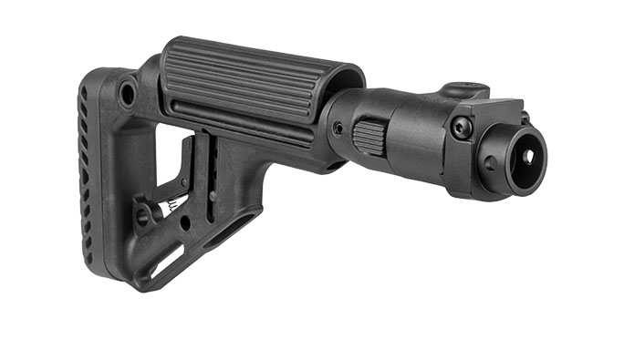 FAB Defense Tactical Folding Buttstock: FAB Defense is an Israeli company that manufactures weapon accessories, including stock sets for nearly every AK variant out there. FAB Defense even makes polymer stocks for the Israeli Galil, Czech VZ-58, Saiga and Dragunov. These stocks are available for stamped and milled receivers, and there is a version that fits traditional under-folders as well. Collapsible models are available as well as those that fold and collapse, like the Tactical Folding Buttstock. These stocks are made of fiberglass-reinforced polymer with rubber buttpads, standard sling attachment points and QD sling swivel points for maximum versatility.