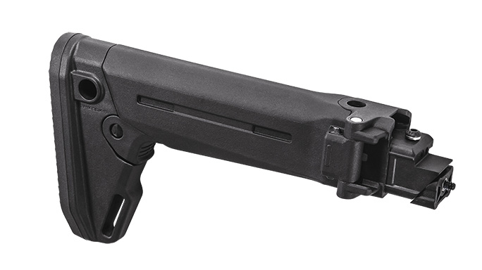 Magpul Zhukov-S: Magpul’s polymer Zhukov-S stock is designed to fit stamped-receiver AK variants, and another version fits Yugoslavian AKs. This stock is feature-laden with ambidextrous QD sling swivel attachment points and five different length-of-pull positions. It also very conveniently folds to the right side, allowing full rifle operation and not interfering with side-mounted optics.