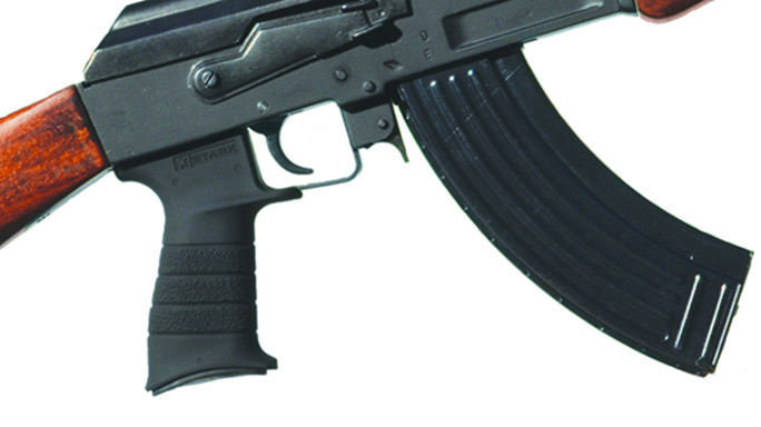 Stark AK-47 Rifle Grip: The Stark AK-47 Rifle Grip represents a vast improvement over standard AK grips. Its polymer construction is robust and completely resistant to weather and chemicals. This grip also has a waterproof internal storage space for two CR123 batteries, and you can also order an optional AA battery plug. To ensure a secure, ergonomic grasp in all conditions, the grip has aggressive texturing, palm swells, a thumb rest, a beavertail and a sharp grip angle. A tab at the front of the grip melds with the triggerguard for more comfort. Finally, the grip is available in a variety of colors.