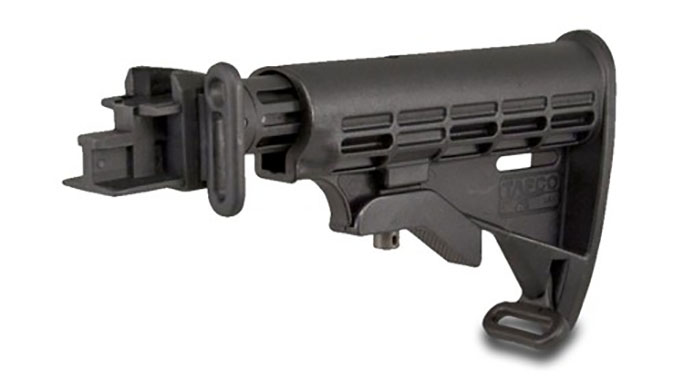 TAPCO AK T6: TAPCO offers a wide variety of polymer AK stock systems in various colors, included standard full-length stocks and collapsible models like the AK T6, which is available for both for both milled- and stamped-receiver AKs. This stock is made from the toughest polymer to stand up to hard use, and users can adjust the length of pull to six different positions. This stock matches TAPCO’s other hardware accessories, including grips and handguards, and the company offers stock options for a variety of AK-platform rifles.