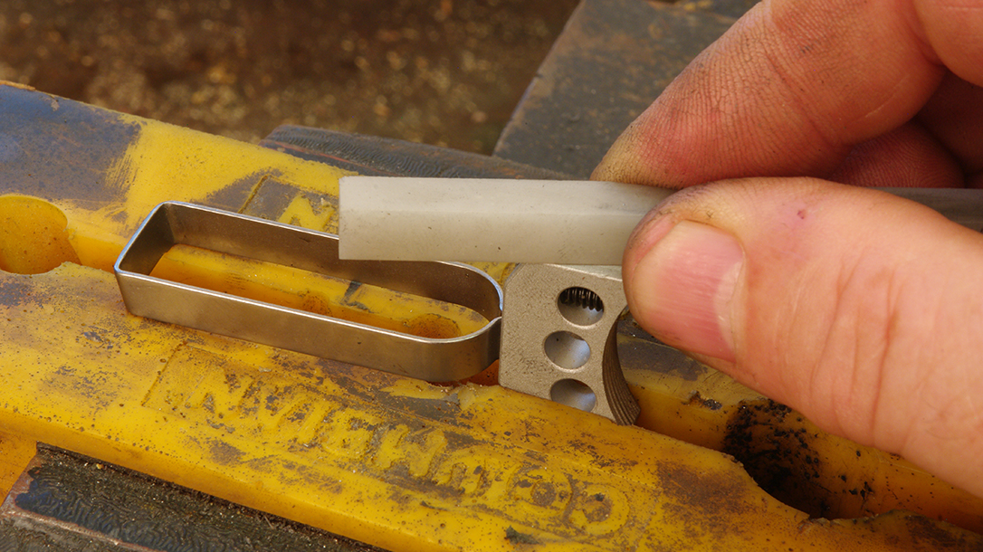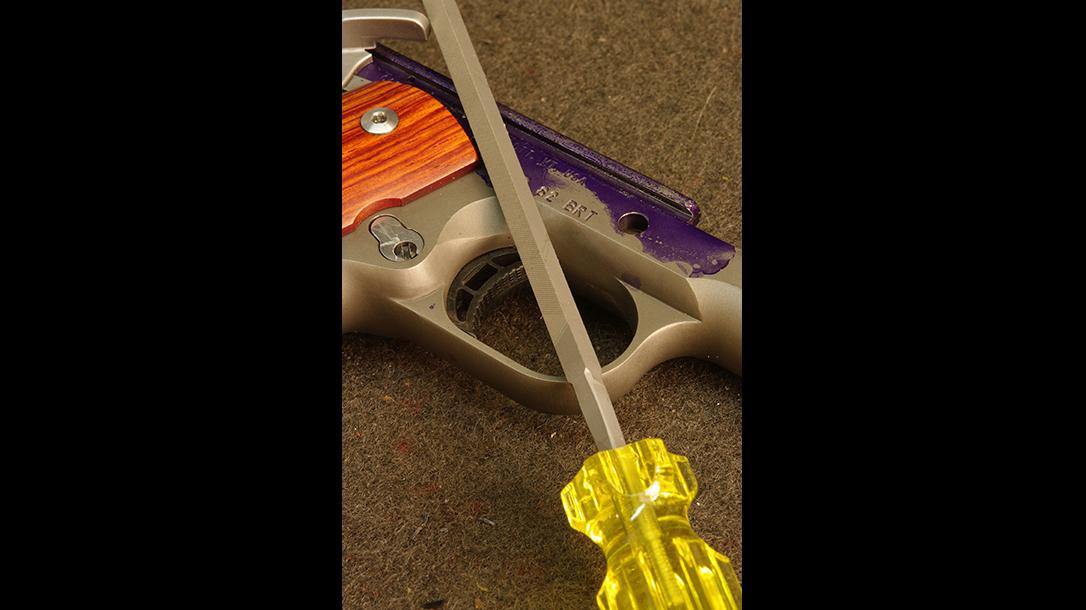 A new trigger must be fitted to the frame. It’s a good idea to smooth the frame slots for the trigger bow using a stone. Brownells makes a stone just for that job called the 1911 Auto Trigger Track Stone. But if you already have a good selection of stones, it’s likely you have one that will work. Now try the trigger bow in the track. It’s easy; just reverse the trigger, but keep it right side up. If it slides easily in and out, you are good. If not, more polishing is needed and perhaps the bow will need a little modification.