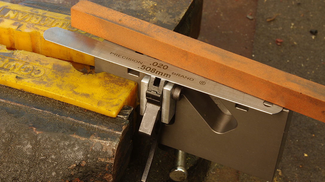 Once the hooks are square, their height must be adjusted to 0.018 to 0.020 inches high. Use a hardened shim or a feeler gauge set against the hooks to act as a spacer. Then stone to the height of the shim. Double-check that the hammer is still in the correct position in the jig and use the stoning guide and a fine stone, followed by a hard Arkansas stone, to polish the contact surfaces on the hammer hooks. Make sure you get all these steps correct on the hammer. If they are not done correctly, it will be impossible to get a good trigger pull.